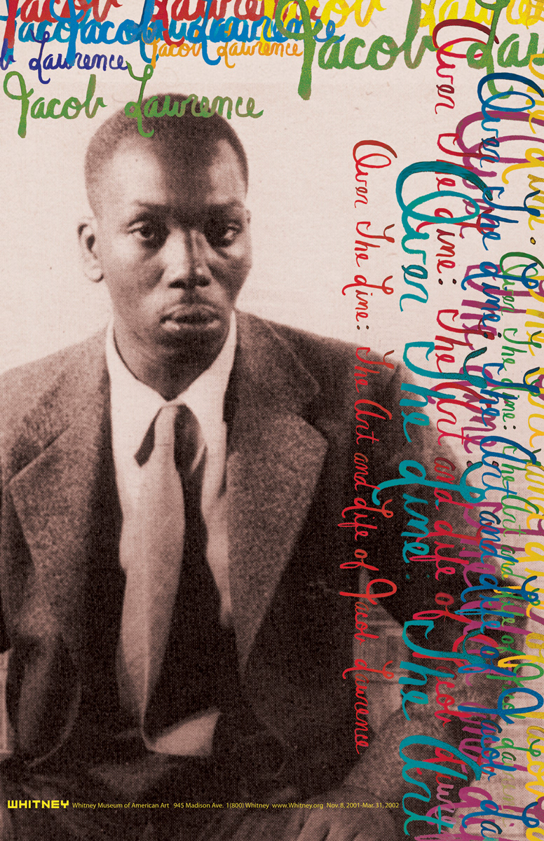 Poster for the retrospective exhibition, Over the Line: The Art and Life of Jacob Lawrence. I created the typography by copying Jacob Lawrence's signature and then manipulating it in Photoshop. The color choices for the typography are based on colors most prominently featured in Jacob Lawrence's body of work. My roles for this project were art director, designer and typographer.